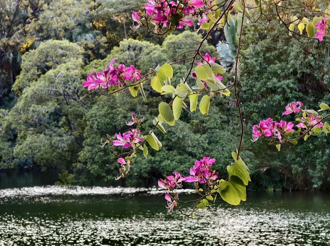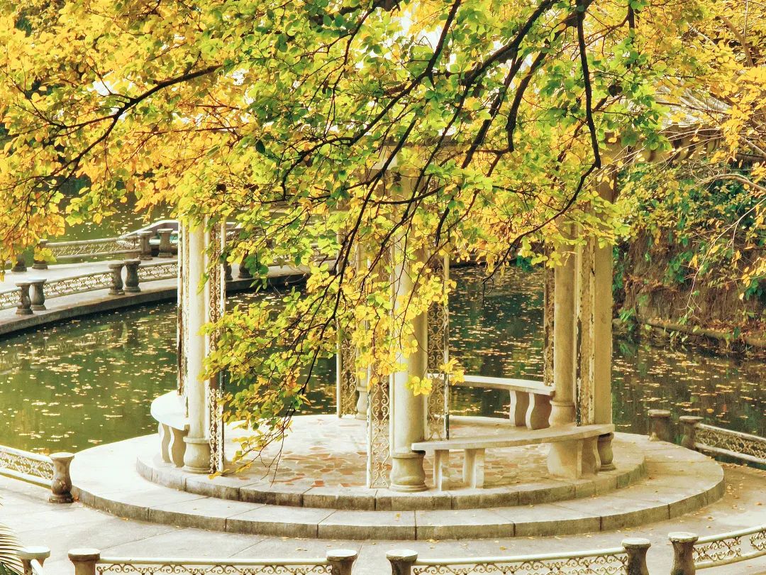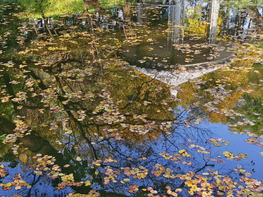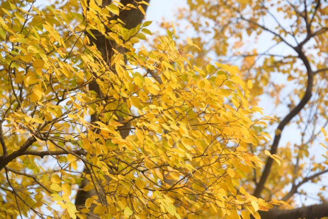 在公园的一些转角处、小桥边、水榭亭台之间,都能遇到朴树的身影。有的枝繁叶茂,在微风中摇曳;有的疏疏朗朗,别有一番意境。低头看,水面上飘落着一些黄叶,远看像掉落的星星,美得像童话里的场景。