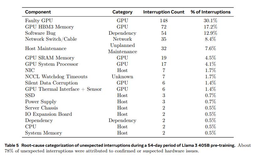 训练意外中断的原因分类,图片来源:《The Llama 3 Herd of Models》
