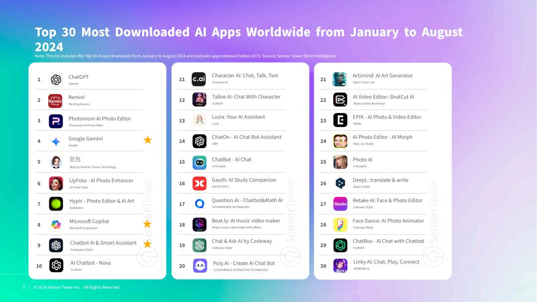 2024年1~8月全球下载量前30位的AI应用,图片来源:Sensor Tower