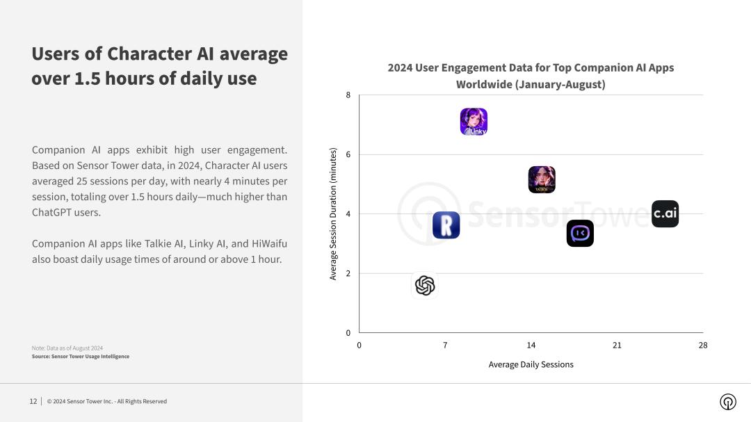 2024年1~8月全球顶级陪伴类AI应用的用户参与度数据,横轴为平均每日会话次数,纵轴为平均每次会话时长,图片来源:Sensor Tower