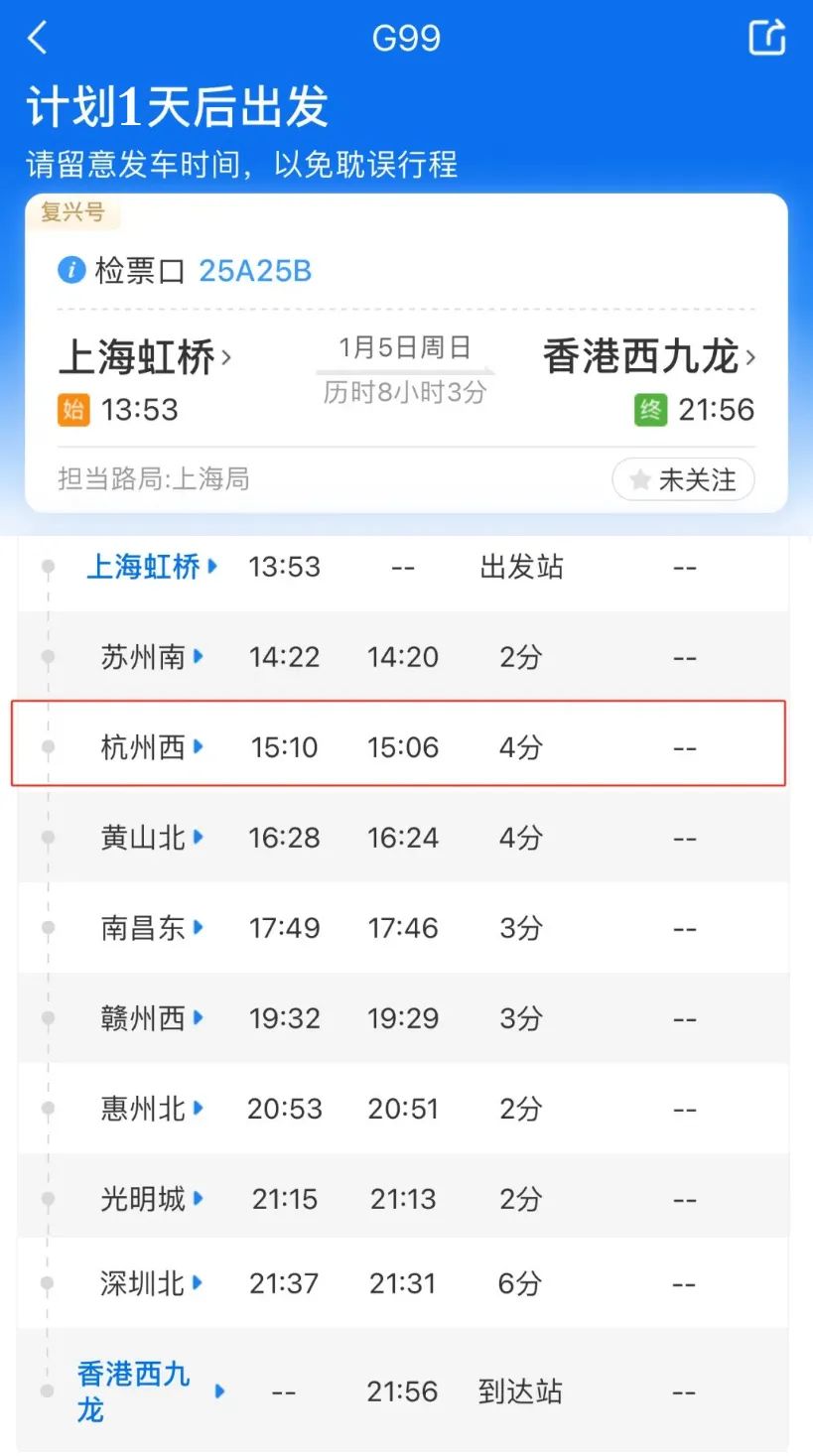 查询12306APP可以看到(点击时刻表,输入车次和选择日期),G99次列车15时10分从杭州西站出发,经过黄山北站、南昌东站等站后,于21时56分抵达香港西九龙站。