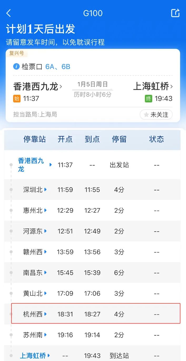 香港西九龙站—杭州西站车次安排如下:G100次列车11时37分从香港西九龙站出发,经过深圳北站、惠州北站等站后,于18时27分抵达杭州西站,全程耗时6小时50分钟。
