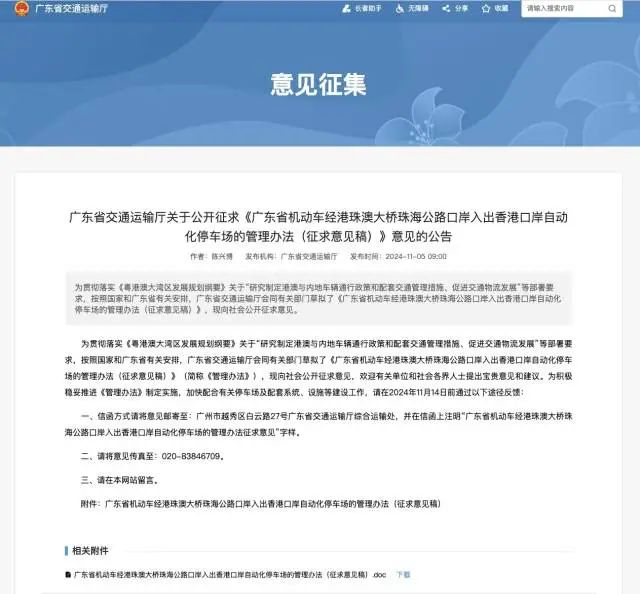 2024年11月5日,广东省交通运输厅发布关于公开征求《广东省机动车经港珠澳大桥珠海公路口岸入出香港口岸自动化停车场的管理办法(征求意见稿)》(以下简称《征求意见稿》)意见的公告。