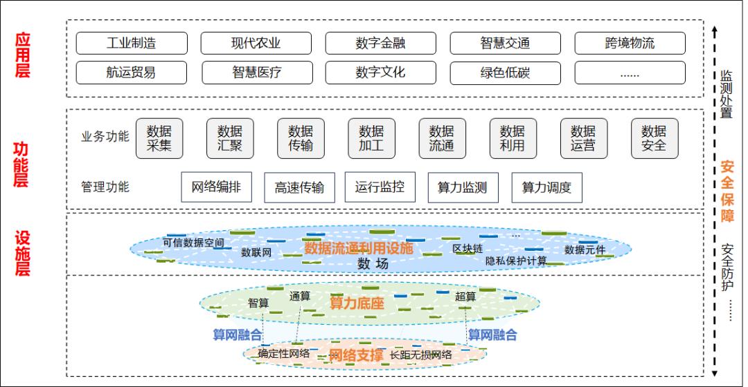 从功能视图看,国家数据基础设施具有数据采集、汇聚、传输、加工、流通、利用、运营、安全八大业务功能,以及网络编排、高速传输、运行监测、算力监测、算力调度等管理功能。