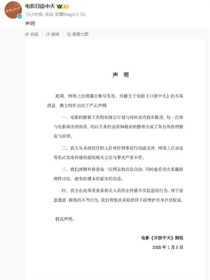 1月5日晚,电影《日掛中天》官方微博发声明称,“我方从未授权任何人针对任何事进行沟通交涉,网络上以录音等形式发布传播的剧组相关言论与事实严重不符。”