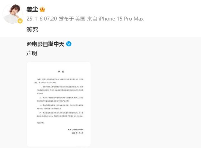 电影《日掛中天》官方微博截图6日早上,姜尘转发这则声明回应:“笑死。”