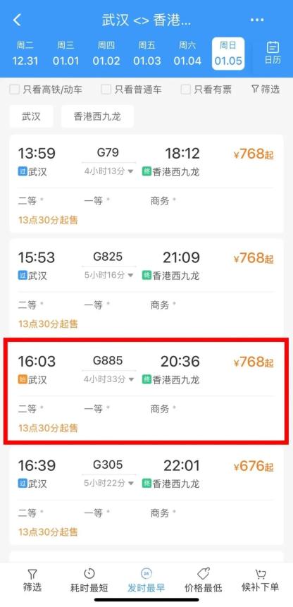 1月5日调图后,武汉前往香港将新增西安北始发途经武汉,终到香港西九龙的G825次列车,和武汉始发终到香港西九龙的G885次列车。G885自1月5日起,每天16时03分从武汉火车站发车,20时36分抵达香港西九龙站。