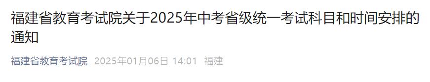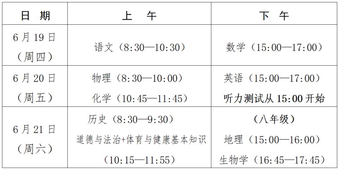 根据《福建省教育厅关于印发福建省高中阶段学校考试招生制度改革实施意见的通知》(闽教基〔2018〕66 号)和《福建省教育厅关于印发福建省初中毕业升学体育与健康考试实施方案(试行)的通知》(闽教体〔2020〕18号)等文件要求,我省初中学业水平考试(以下简称“中考”)的语文、数学、英语、道德与法治、历史、地理、物理、化学、生物学等9个科目及体育与健康基本知识考试实行省级统一考试,全部实行书面闭卷笔试形式。其中,《道德与法治》科目与《体育与健康基本知识》考试同场合卷进行。经研究,2025年中考省级统一考试安排在6月19日—21日举行,具体科目考试时间安排如下: