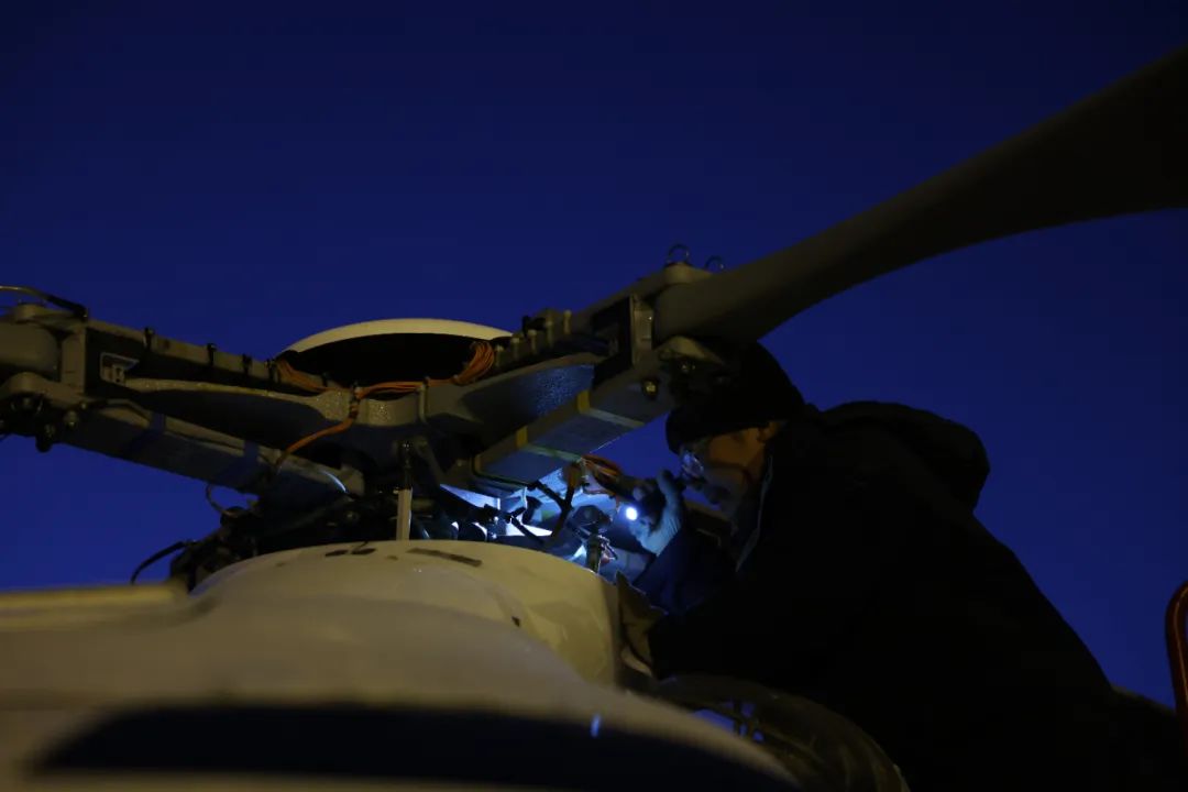 撤下支撑杆、卸掉蒙布、进行飞行前移除、通电按程序检查直升机各系统……在高原上,普通人快走几步就会感觉心跳加速、头晕目眩、四肢无力。而钊哥和机务“战友”们却总能顶着一股劲儿,保持稳定的速度装卸部件。与此同时,机组与技术人员们正在召开航前会。结合当日的气象条件与前一日的飞行数据,技术团队很快确定了最后一日试飞科目和各项飞行参数。