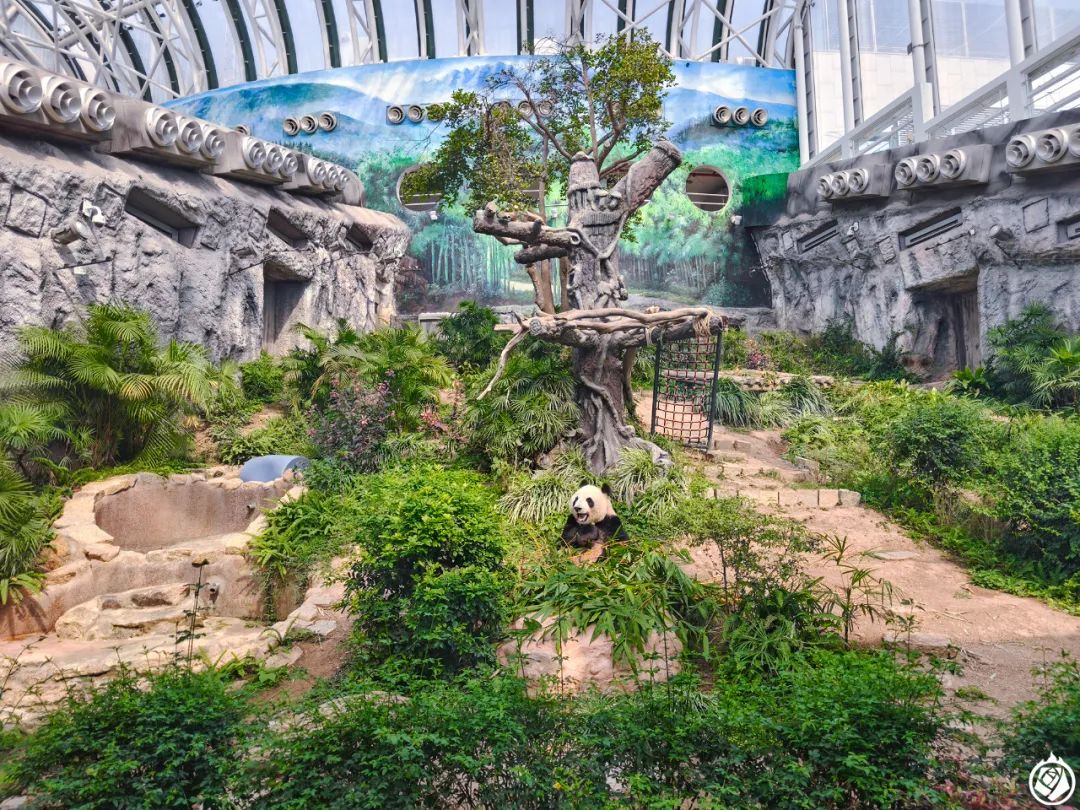 澳门的熊猫在石排湾郊野公园。这里的熊猫馆是个很大的像温室一样的玻璃建筑,透光很好,内部和外部都有几个展区,展区不大,但植被、爬架什么的相对比较丰富。在室内,场馆里的冷气很足,营造出了熊猫喜欢的气温。不过看看头顶的巨大玻璃顶,这冷气大概很耗能吧。