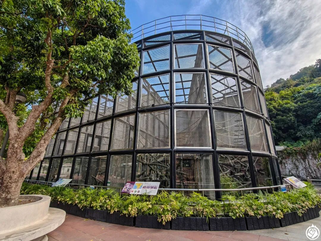 除了熊猫,石排湾郊野公园内还养了小熊猫、川金丝猴和白颊长臂猿等数种灵长类、好几种鸟。整体展区面积都不大。灵长类的展区好在建筑高,让这些擅长攀爬的动物能够利用高处空间。鸟舍硬件相对较为老旧、狭小,尤其鸵鸟的展区。