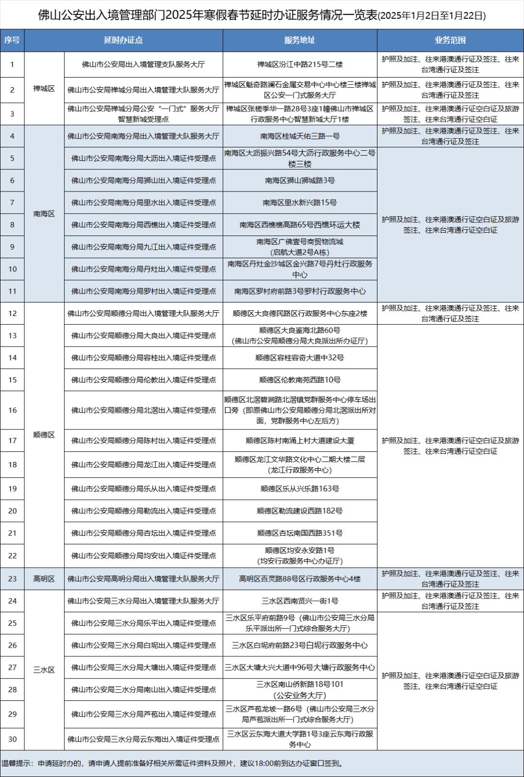 (三)如您近期无具体出国(境)计划,可安排春节后其他时间错峰办理出入境证件,佛山公安出入境管理部门将竭诚提供优质、高效、便捷服务。