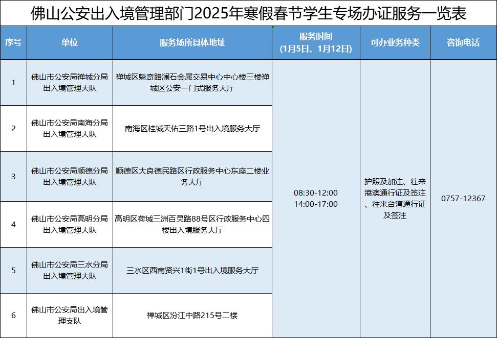 1.佛山公安出入境管理部门6个办证大厅(详见下图);