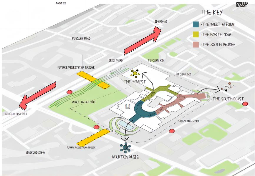 上海宜家荟聚购物中心模糊了购物中心和城市之间的边界,通过多个商业出入口,下沉广场及地下通道连接,自然地融入社区、城市和生活中。