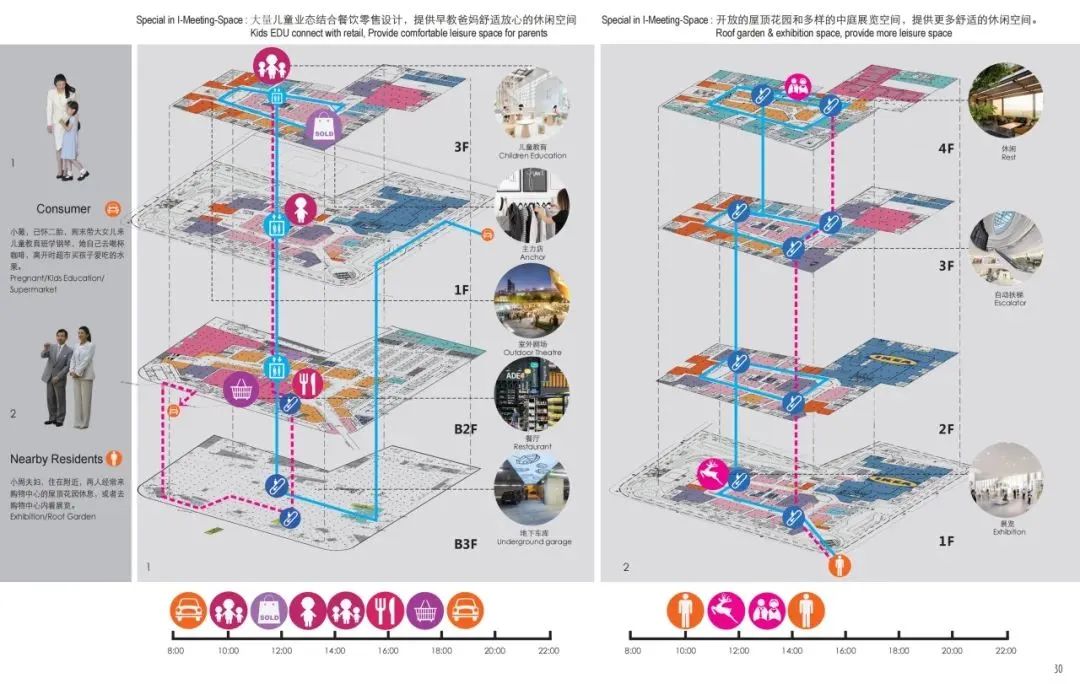 多样的业态对于建筑的消防设计也带来了更多的挑战。针对办公、儿童,餐饮,影院,屋面商业街,超大地下商业空间等特殊疏散要求的区域,通过对于整体防火分区的布局优化,在满足疏散安全的前提下,最大化提升商业整体得铺率,创造出更多商业价值空间。