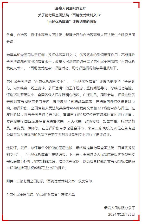 原标题:《喜报!北京互联网法院两案分获第七届全国法院“百篇优秀裁判文书”“百场优秀庭审”》