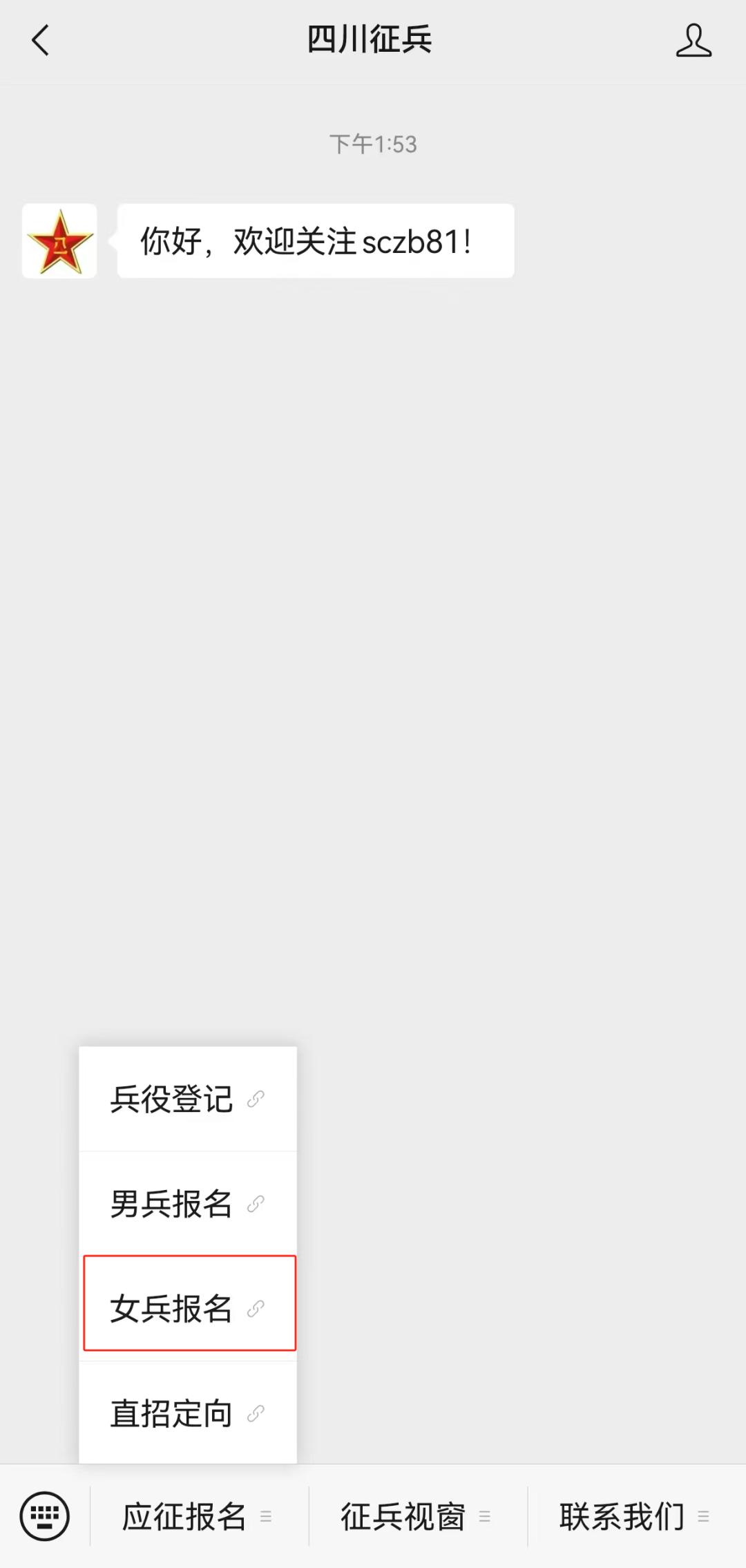关注“四川征兵”公众号,在对话页面点击左下角“应征报名”,选择“女兵报名”即可进入报名页面。