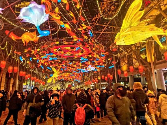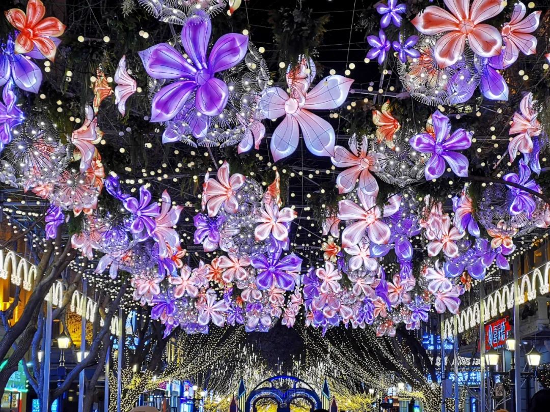 走在大街小巷,精巧琳琅的各色灯饰景观不时映入眼帘。高楼大厦外墙上,五彩斑斓的灯光交织成一幅幅绚丽的画卷,将城市的轮廓勾勒得格外分明。星罗棋布的灯饰宛如点点繁星,与城市中的万家灯火交相辉映,营造出一种温馨浪漫的舒适氛围,让人忘却夜的寒冷。街道两旁的树木上,缠绕着、悬挂着各式各样的彩灯,闪烁着温暖而迷人的光芒,犹如一条条光带引领着路人前行,让人恍惚觉得尽头就是童话的故乡。