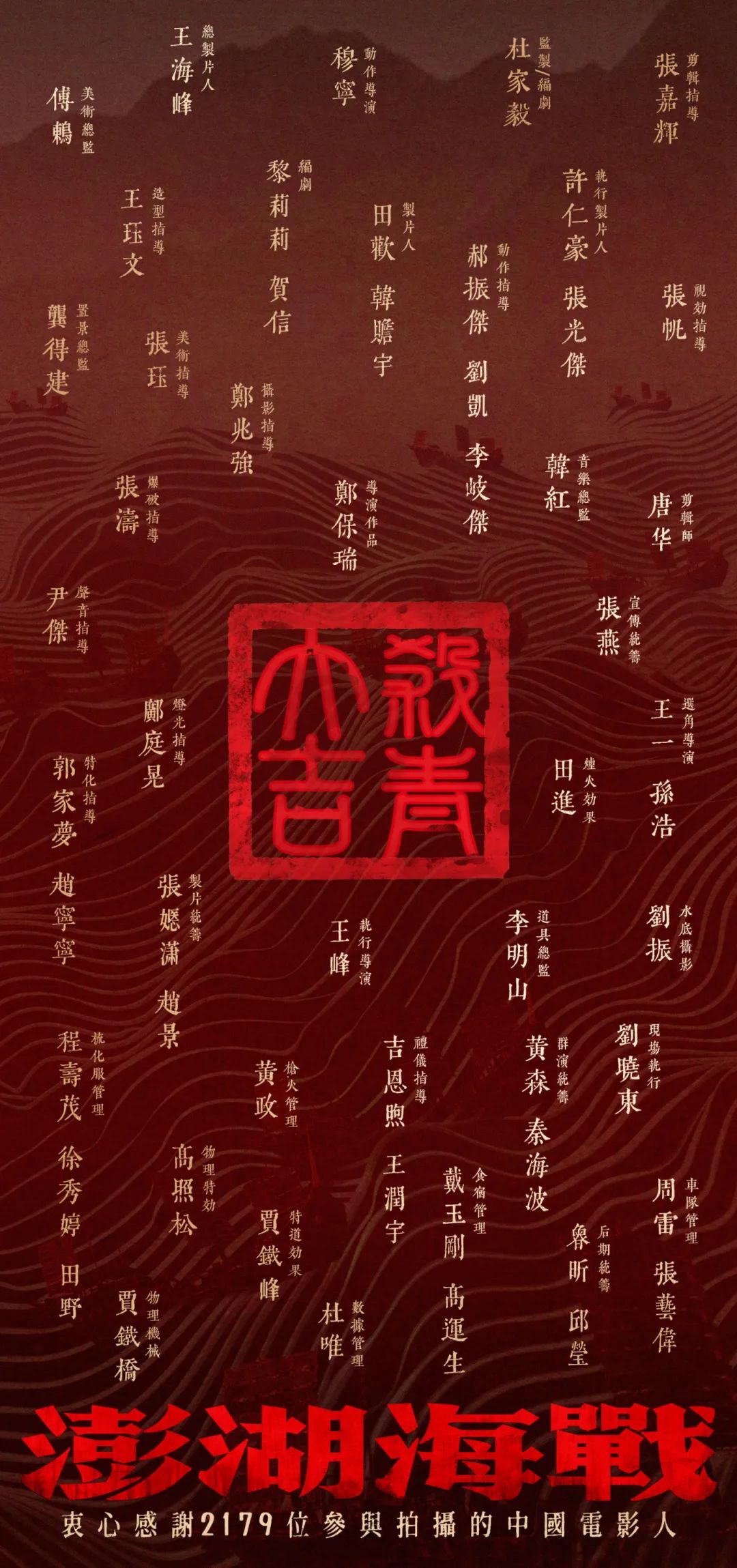 ●历时34个月准备,6个月拍摄,共计2179位演职人员,辗转福建泉州、江苏无锡两地拍摄,一比一真实还原海战中的战船,国家重点影片《澎湖海战》的幕后工作十分艰辛。