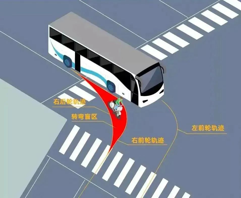 从现实情况来看,造成大型车辆右转弯事故多发主要有两个原因,一是大型车辆转弯时存在多处视觉盲区,二是大型车辆右转弯时,右侧前后车轮行驶轨迹不同存在“内轮差”。