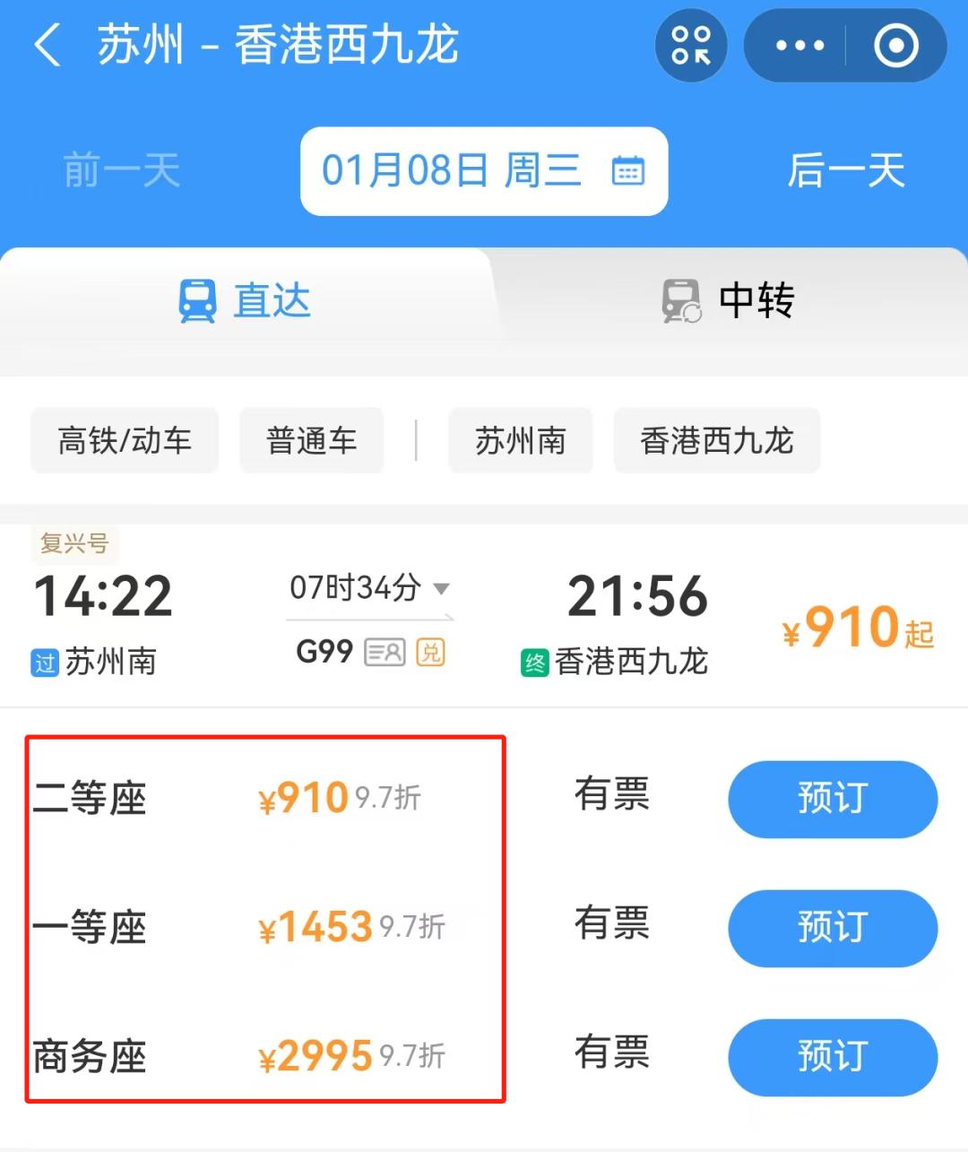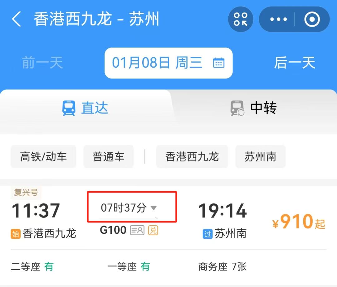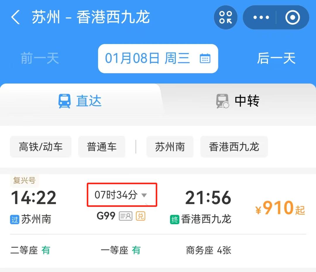 到达苏州南站后,在“铁路12306”APP内输入苏州南站到香港西九龙站,选择出行日期、动车车次,即可购票。全程约7个半小时