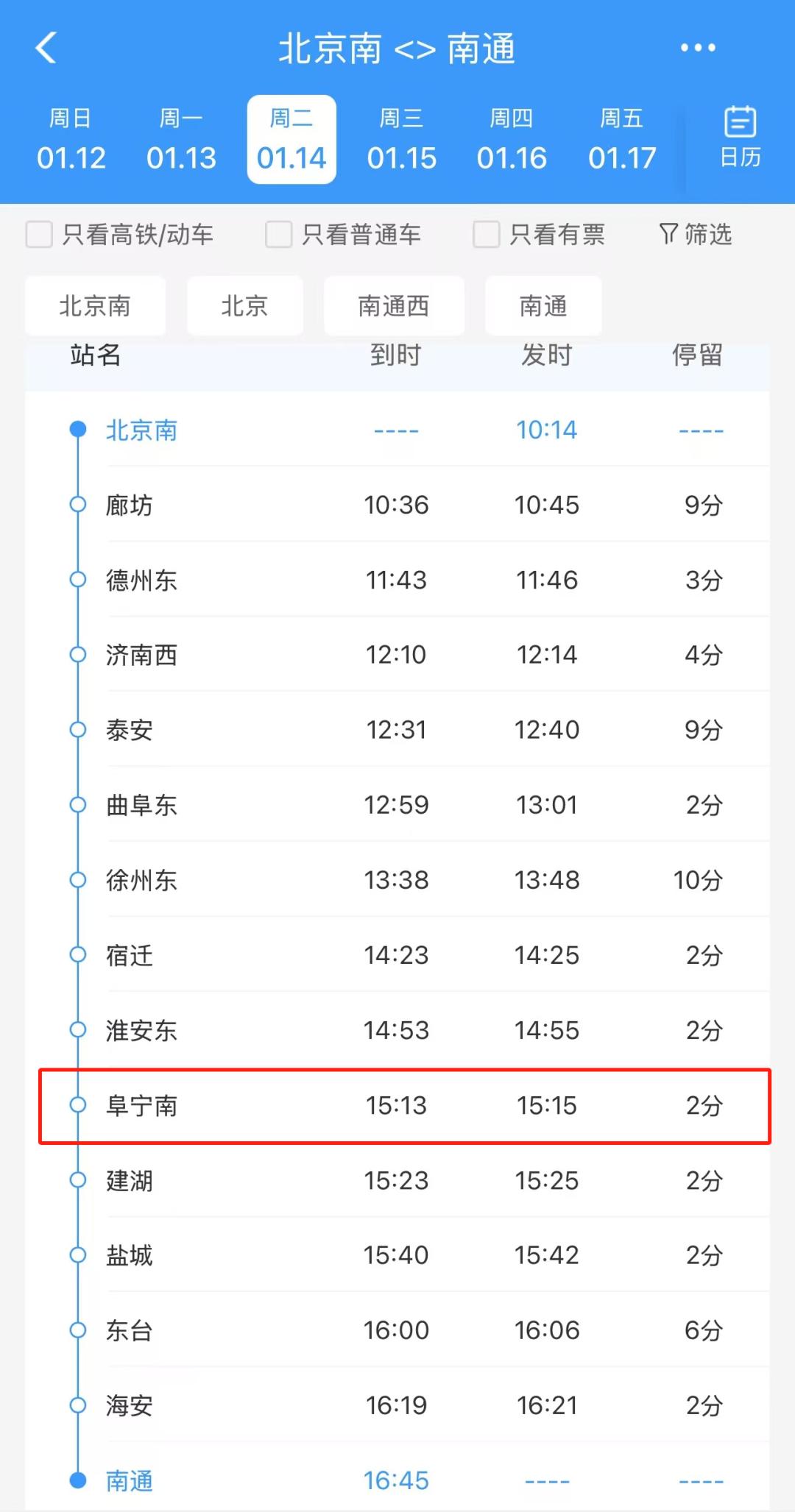 涉及阜宁南站的有2个车次