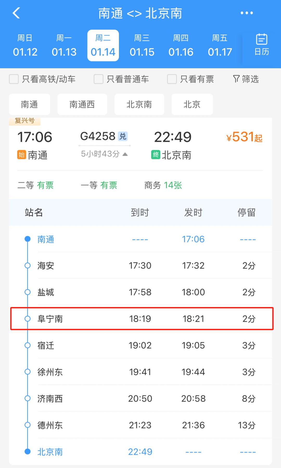 G4258次列车17:06从南通站始发,途经海安、盐城、阜宁南(18:19到达)、宿迁、徐州东、济南西、德州东,最后到达北京南站(22:49到达)。