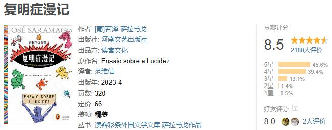 《复明症漫记》是萨拉马戈的一部长篇小说,建议和《失明症漫记》搭配使用。如果说《失明症漫记》是一场瘟疫,那么《复明症漫记》就是一次政治斗争。前者因周遭太亮,眼前都是一片白色而众生失明,后者则因周遭太暗,眼前都是一片深色,暗潮涌动。在《复明症漫记》中,有更多的政治隐喻:当民众失望后却不得不投票选举时是可以投空白票,当政府撤离,留下“无政府状态”的首都后,却如同暴徒一样施恶,当找不到失去民众支持的原因时是可以随意捏造一个替罪羊来解释这一切……多么熟悉又多么让人心寒的一幕幕。