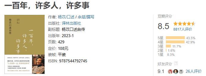 《一百年,许多人,许多事》是杨苡的口述自传,穿过百年岁月,更多其实是聚焦在前半生。看这本书,时常要被杨苡回忆里的赵瑞蕻气死,就这人感觉从头到脚没一处优点。杨苡不是直接下结论,而是举了一个又一个的事件,让人得出这样的结论。光是这一点,就非常难得。人人皆知,枕边人是最难处的,但又有谁敢明目张胆地指责呢?说到赵瑞蕻,就不得不说大李先生,世间事归根到底还是爱。亲情、爱情、友情,在时代被淘洗之后,最让人回味的还是人与人之间的爱。这也是很喜欢里面爱情故事的原因。百年、民国、世家,见证了一个世纪的沉浮,那些大家出现在她的周围,但她始终如贵族小姐,天真,是真的天真到不忍评判。真希望之后能读到更多像这样的书。
