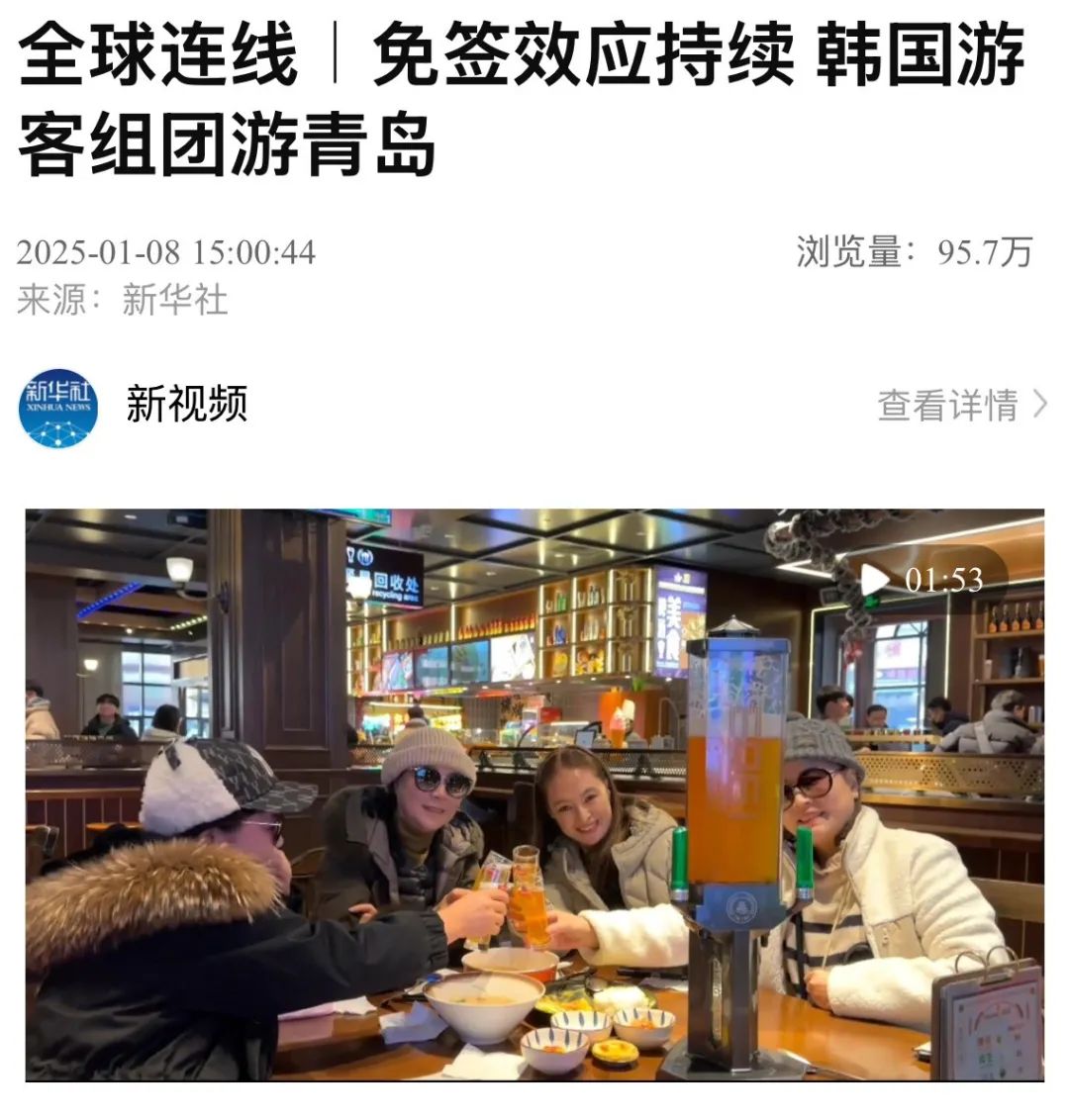 日前,新华社发布稿件《免签效应持续 韩国游客组团游青岛》,免签政策带动了青岛旅游业的发展,也促进了中外文化交流和友好往来。