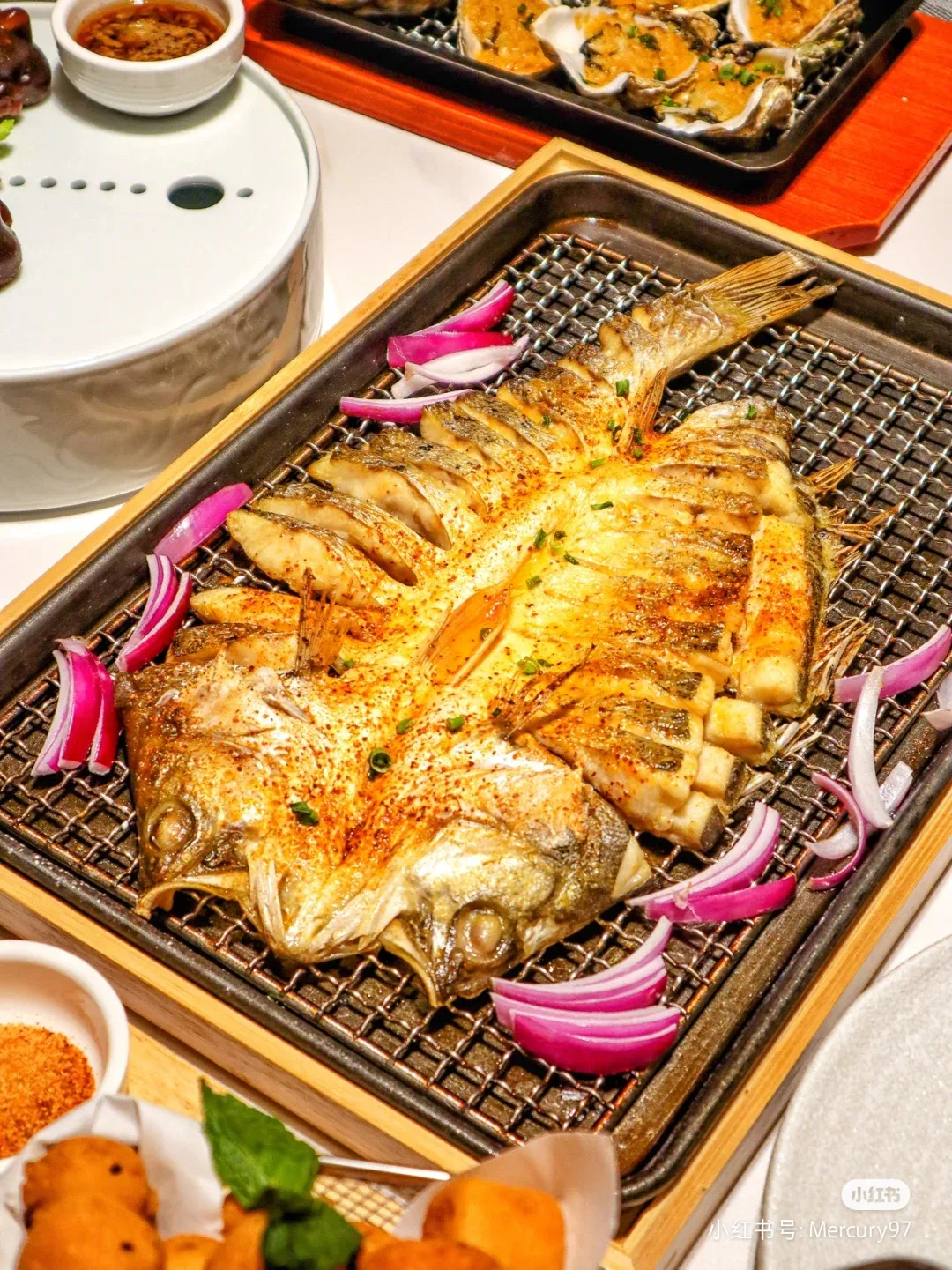 青岛烤鱼宛如一件精美的海畔艺术品。外皮在烤制下绽出金黄微焦的色泽,以鲜嫩的鱼肉和爽滑的口感“出圈”。
