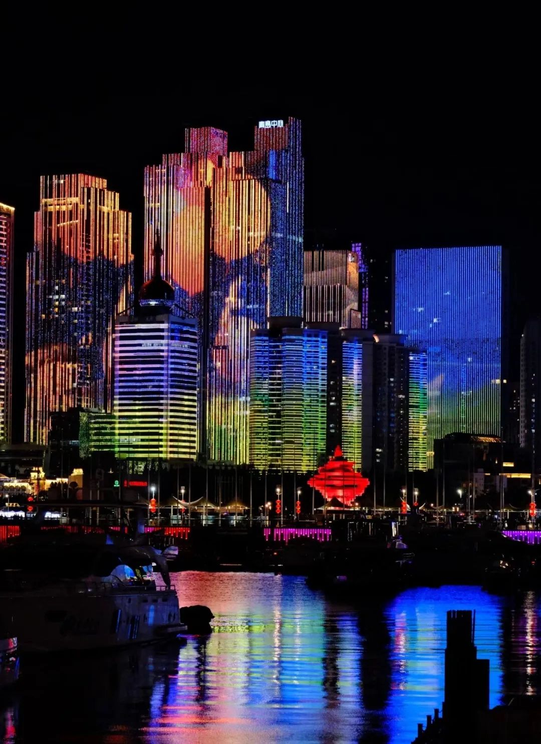 夜晚五四广场周边建筑霓虹闪烁,与海面上的游船灯火相互辉映,如梦似幻!