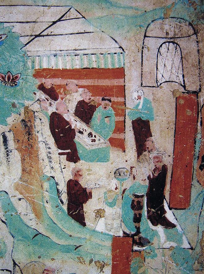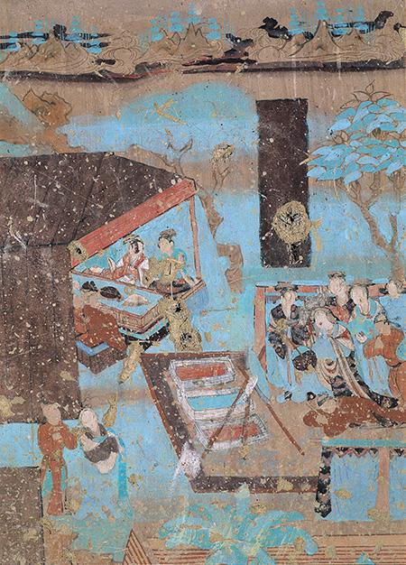 图中宅第门外设帷帐,帐内宾客对坐饮宴,帐前正举行婚礼,其间舞者正伴随着音乐起舞。研究者认为此舞为“绿腰”(也称“六幺”)。对面有六人乐队伴奏,有吹箫、吹笙、击鼓、击拍板等。