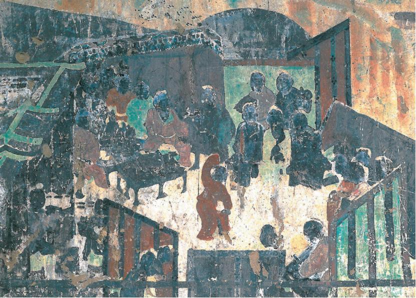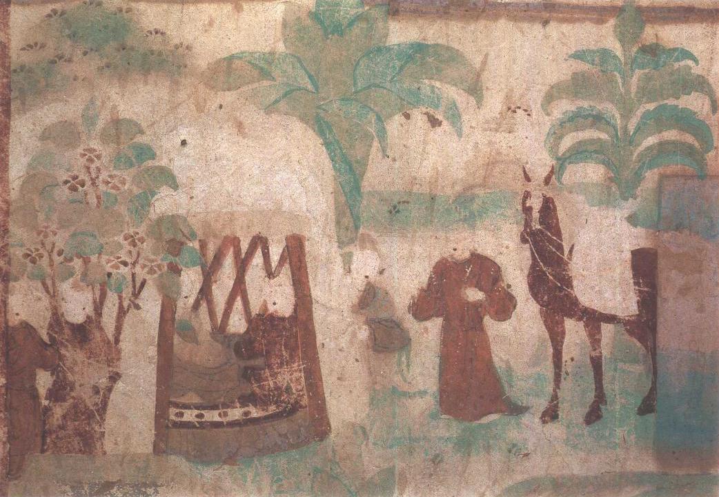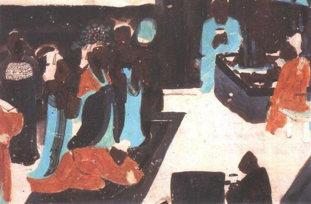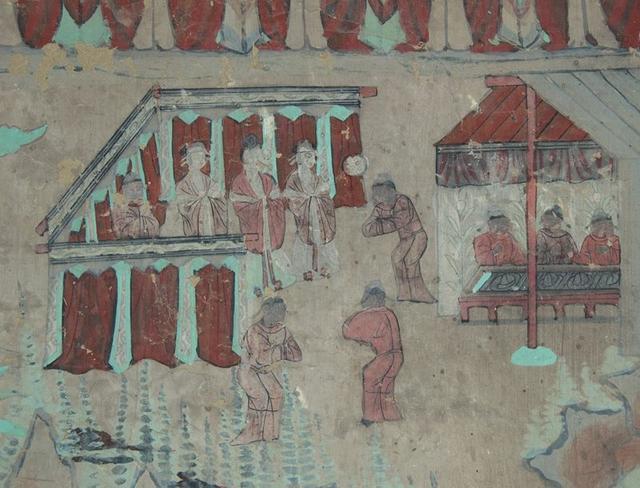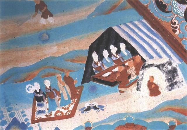 莫高窟360窟为毡帐青庐庐内新婚夫妇相对盘坐。按礼仪规定其位置应是男东女西。庐外傧相侍者恭候,牵马以待。青庐之俗早在东汉时已有记载,《孔雀东南飞》有诗曰:“其日牛马嘶,新妇入青庐。”