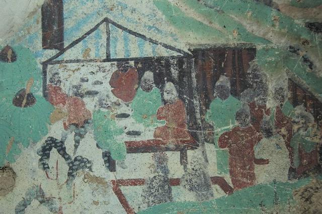 其中自西数第三幅壁画中描绘了一千多年前世俗婚礼的场面,图中宅第门外设帷帐,即“青庐”,帐内宾客对坐饮宴,帐前正中陈列的是新郎送给新娘的彩礼,三叉支架上竖圆形镜子一面,的新郎五体投地,跪拜宾客;新娘盛装,侧立于旁。