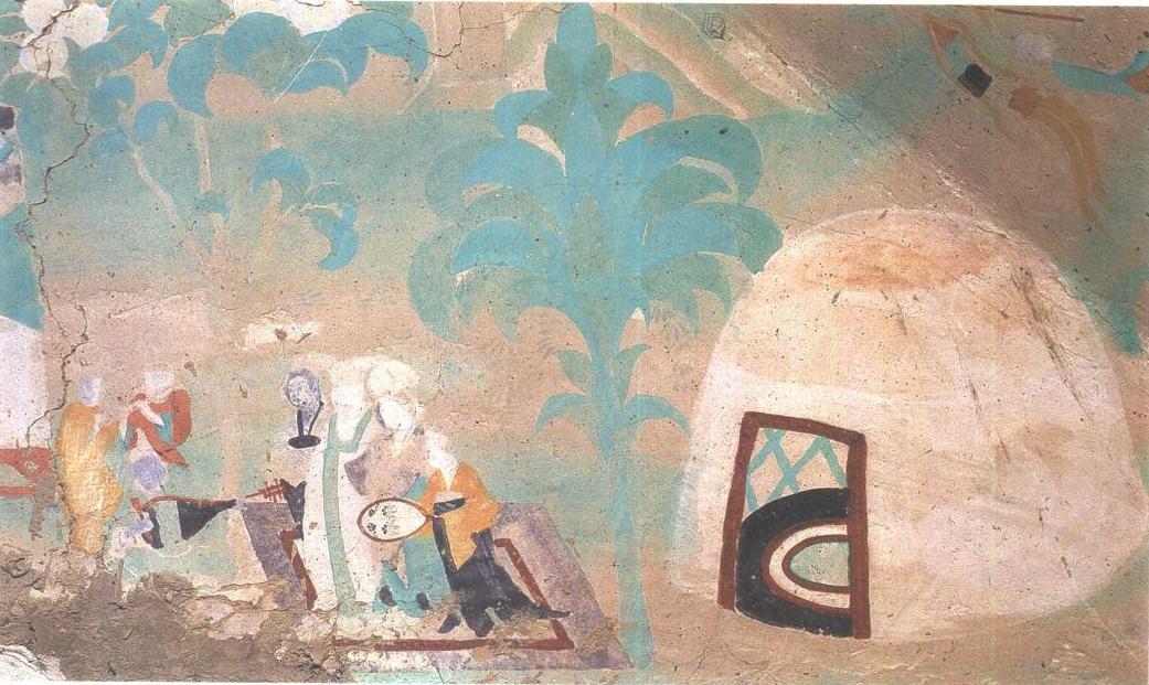 婚礼图中间方形毯上是新郎新娘。右侧是青庐,形制是圆顶微型穹庐,内壁可见枝木交叉作菱形,这种结横可张可开阖,称为“百枝帐”,取吉祥之意,又称“百子帐”。地面铺一圆形花毡,供新郎、新娘就坐。左侧有三人合奏:分别是琵琶、洞箫和拍板。