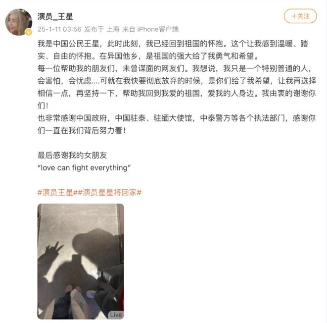 1月5日,自称中国籍男演员王星女友的网友发文称,王星在泰缅边境失联。