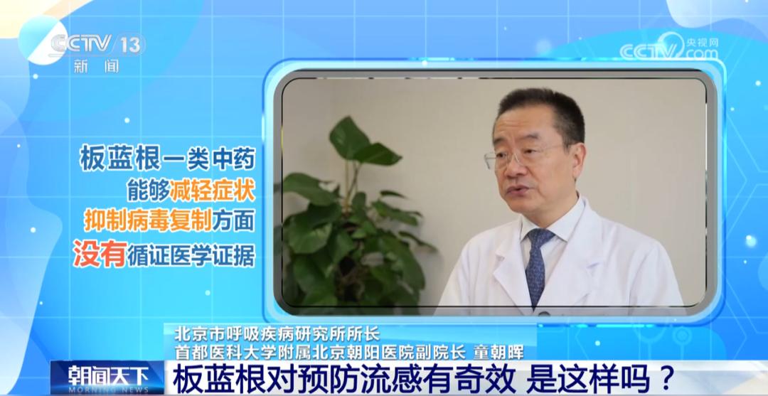 北京市呼吸疾病研究所所长、首都医科大学附属北京朝阳医院副院长 童朝晖:其实像这一类的中药,板蓝根也好,还有其他的一些药物,并没有抑制病毒复制的作用,它实际上是起到一个清热解毒的作用,能够减轻症状,但是说它能抑制病毒复制,我觉得至少目前没有循证医学证据。预防流感