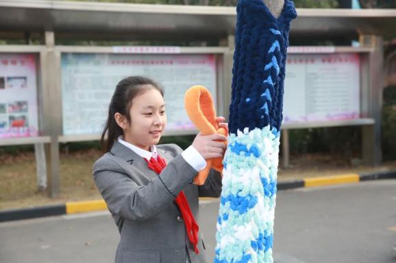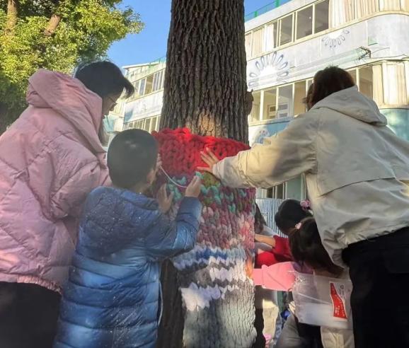 暖冬计划发起后,得到了不少孩子和家长的支持。很快,孩子们完成了校园大树的认领工作,并为自己的“树朋友”量起了“身高”和“腰围”。在两天的编织过程中,参与活动的家长和孩子展现了非凡的创造力,有的衣服有眼睛、有辫子,有的衣服有流苏、有花纹,有的衣服上面还趴着玩偶……这些有趣的造型,让整个幼儿园变得多姿多彩。