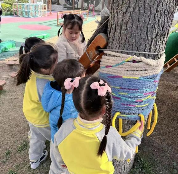 龙柏第二幼儿园大三班幼儿裴喆依的妈妈是一位编织爱好者,经常来校园分享手工制作。作为此次幼儿园暖冬计划的倡导者,她表示,幼儿园是一个充满童话感的世界,让孩子们一起动手为大树编织毛衣,既是一次“保护自然”的课堂实践,也能让孩子们“沉浸”在童话世界里,感受童趣。