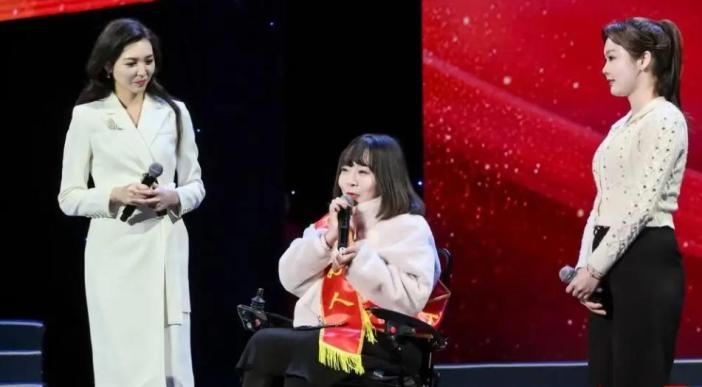 “广东好人”蓝玉娜(中)上台接受采访。来源:网络梅州“90后”女孩蓝玉娜因车祸一夜之间失去至亲,并被宣告终生与轮椅为伴,手指也无法动弹。美好的生活似乎在20出头的年纪骤然崩塌,一开始她每天都在和死神斗争,刚做康复治疗时,连穿衣、吃饭、坐立这样的简单动作都无法独立完成。