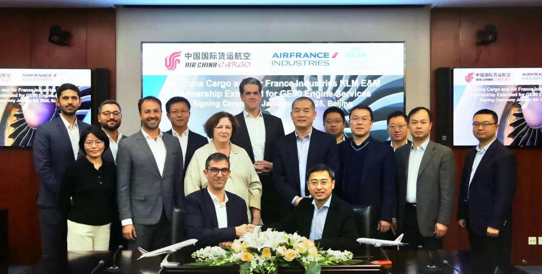 1 月 13 日,法航工业荷航工程与维修(AFI-KLM E&M)宣布,与中国国际货运航空股份有限公司(国货航)共同签署“PBH(按小时包修)合同补充协议”,扩大了双方现有GE90型发动机包修业务。On January 13, Air France Industries KLM Engineering & Maintenance (AFI KLM E&M) announced the signing of a significant extension to the existing Power-By-the-Hour (PBH) contract with Air China Cargo Co., Ltd, expanding the existing GE90 engine repair business between the two parties.