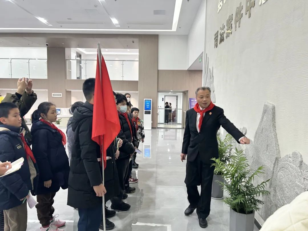 四级高级法官刘安带领30余名师生参观了诉讼服务中心、调解室、民事审判庭、刑事审判庭、少年法庭等法院场所,带领同学们了解法庭设置、庭审流程。