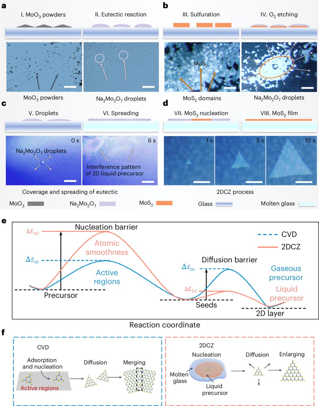 图2 2DCZ机制2DCZ方法的机理:2DCZ生长过程中引入的液相显著改变了反应过程。大尺寸的MoS2晶畴是通过抑制成核势垒和促进扩散势垒而获得的。最初,熔融玻璃呈现出原子级光滑和无缺陷的表面,显著增强了成核势垒。这降低了生长过程中的形核密度,从而削弱了材料和衬底之间的耦合力。此外,由于液-液体系中熔融玻璃的表面张力较大,液态前驱体容易铺展,最终在二维液膜与衬底之间形成单独的界面。预铺展的前驱体在衬底上的扩散势垒远低于通过气相吸附-扩散-生长的CVD法,这极大地提高了生长速率,达到了75μms-1。因此,超低的成核密度和超快的生长速率相结合,使得MoS2从多晶向单晶转变,实现了超大尺度的晶界消除