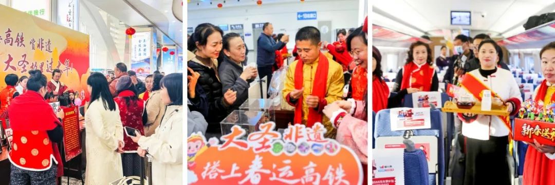 上午9时许,由徐州车务段和市文广旅局联合主办的“乘高铁 赏非遗 大圣故里过大年”活动开场。歌舞表演、书法家现场创作的春联、精致的剪纸窗花、俏皮的糖画、活灵活现的面塑,更有免费的早餐、葛根粉、云雾茶等供大家品尝,新鲜的元素为旅途增添了不少年味。