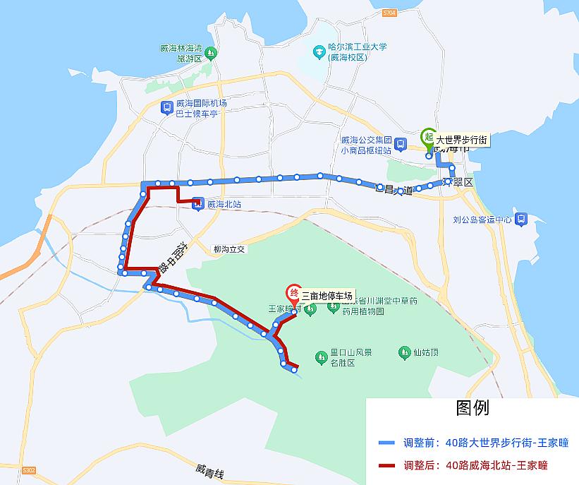 40路首末站由大世界步行街调整至威海北站,调整后,由威海北站发车沿环山路、科技路、世昌大道至光威集团站点恢复原线路运行至王家疃。