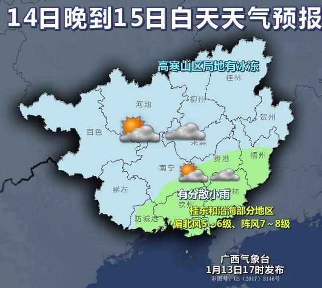 1月14日白天到晚上,梧州、玉林、北海、钦州、防城港等市多云转阴天有分散小雨,其它地区多云转阴天。高寒山区局地有冰冻。最低气温:高寒山区-3~4℃,桂北5~9℃,桂南7~12℃。