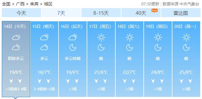 14-15日,受冷空气影响,桂东和沿海部分地区有5~6级、阵风7~8级偏北风。南宁市:今天白天到晚上,阴天间多云,东北风2~3级、阵风6~7级,最高气温18℃,最低气温12℃。