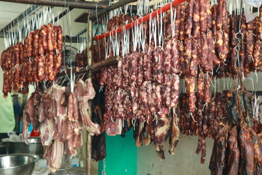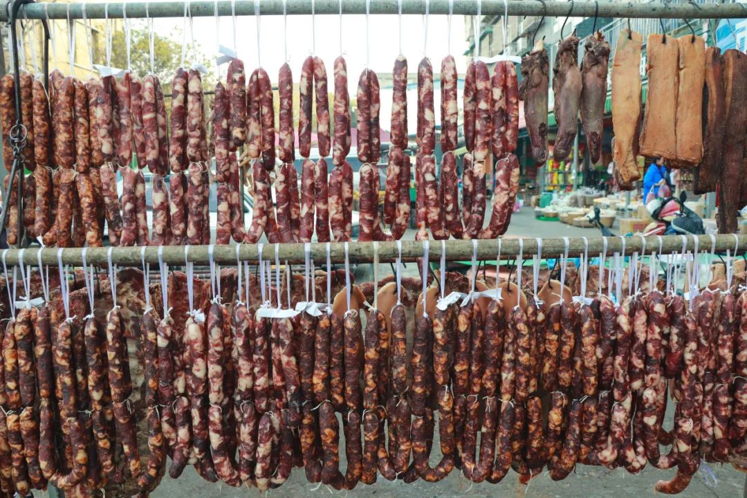 看着市场里一排排悬挂着的腊肠,充满了属于郫都冬日里的温暖与幸福。“腊味”不仅仅是餐桌上的美味、年货市场上的热销产品,更是连接人心和传递年味的纽带。