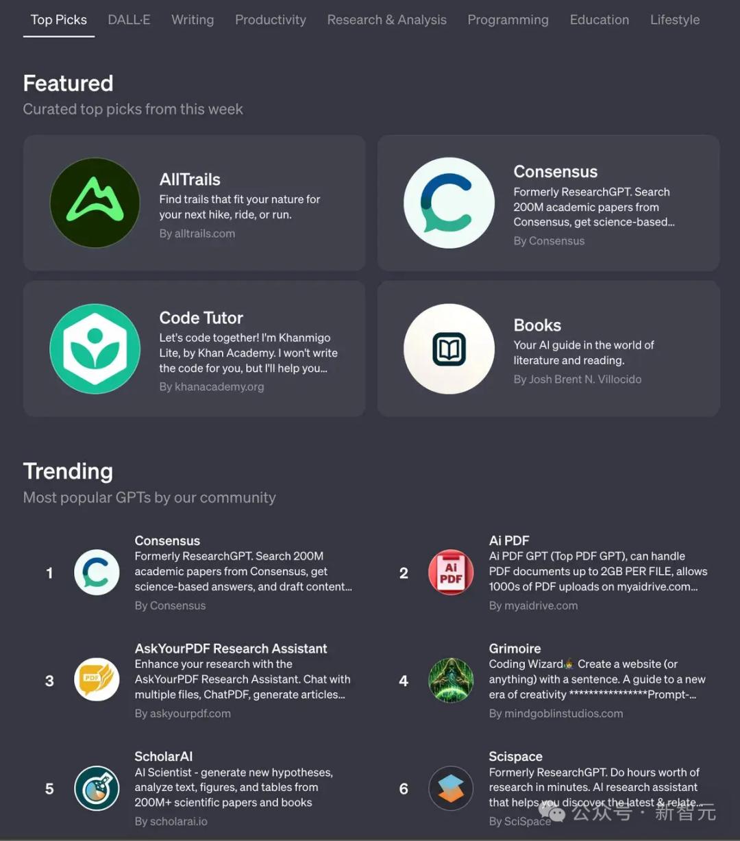 GPT商店:用户可以发布构建的个性化聊天机器人(GPTs),按类别进行搜索,如写作、生活方式和教育等。